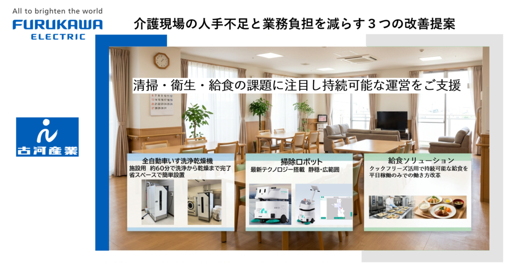 持続可能な施設運営を「食・衛生・清掃」の3軸でサポート。掃除ロボットのデモに加え、給食改革や車いす洗浄機による業務効率化を提案します。テクノロジーの融合で、現場の負担を軽減し、経営をご支援。